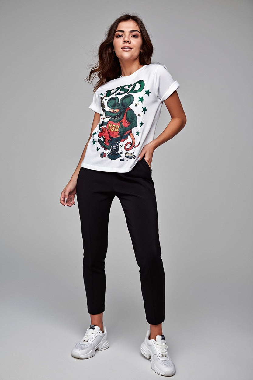 Neck Comfort: Soft, ribbed crew neckline for a smooth, tag-free feel that layers effortlessly under jackets or stands alone. Subtle Back Detail: Clean white canvas with a discreet VSD neck label for understated branding that keeps the focus on the front's playful chaos
