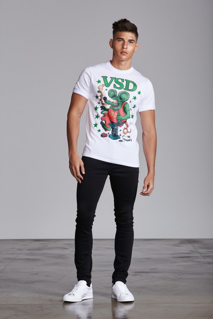 Edgy Cartoon Graphic: Featuring a wild, retro-inspired green rat character mid-pogo with smoke trails, starry accents, and bold VSD branding in vibrant hues for that irreverent, underground edge.