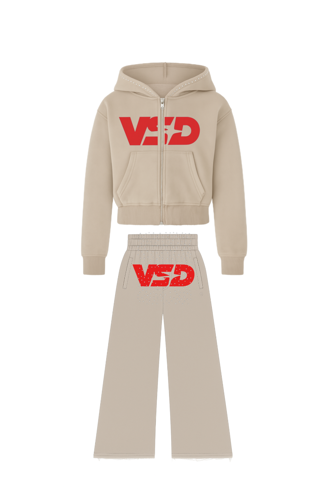 Matching Set Design: Complete tracksuit in versatile beige with bold red "VSD" starburst logo, ideal for coordinated street style and effortless cool